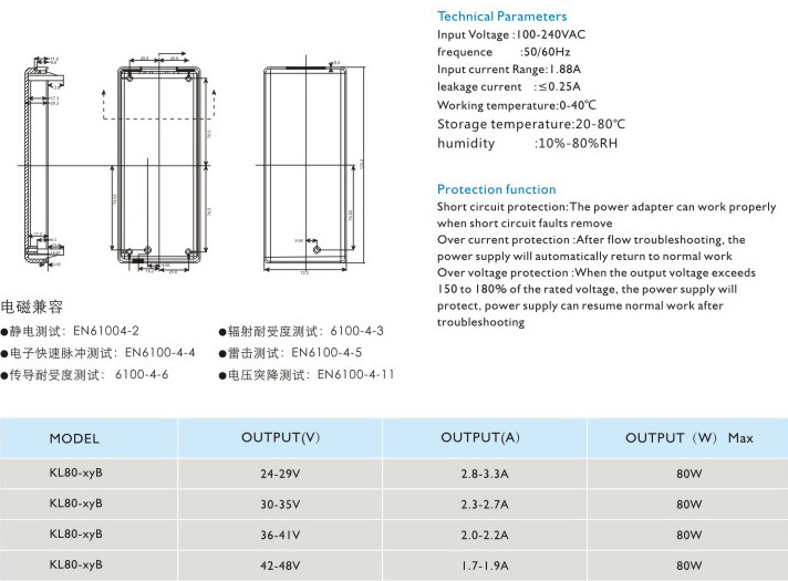 過流保護(hù):過流故障排除后,電源將自動恢復(fù)正常工作 過壓保護(hù):當(dāng)輸出電壓超過額定電壓的150~180%時,電源將保護(hù),故障排除后電源能恢復(fù)正常工作 輸入電壓:100-240VAC 頻率:50/60Hz 輸入電流:1.88A 漏電電流:<0.25A 工作溫度:0-40℃ 貯藏溫度:-20-80℃ 濕度:10%-80%RH" />